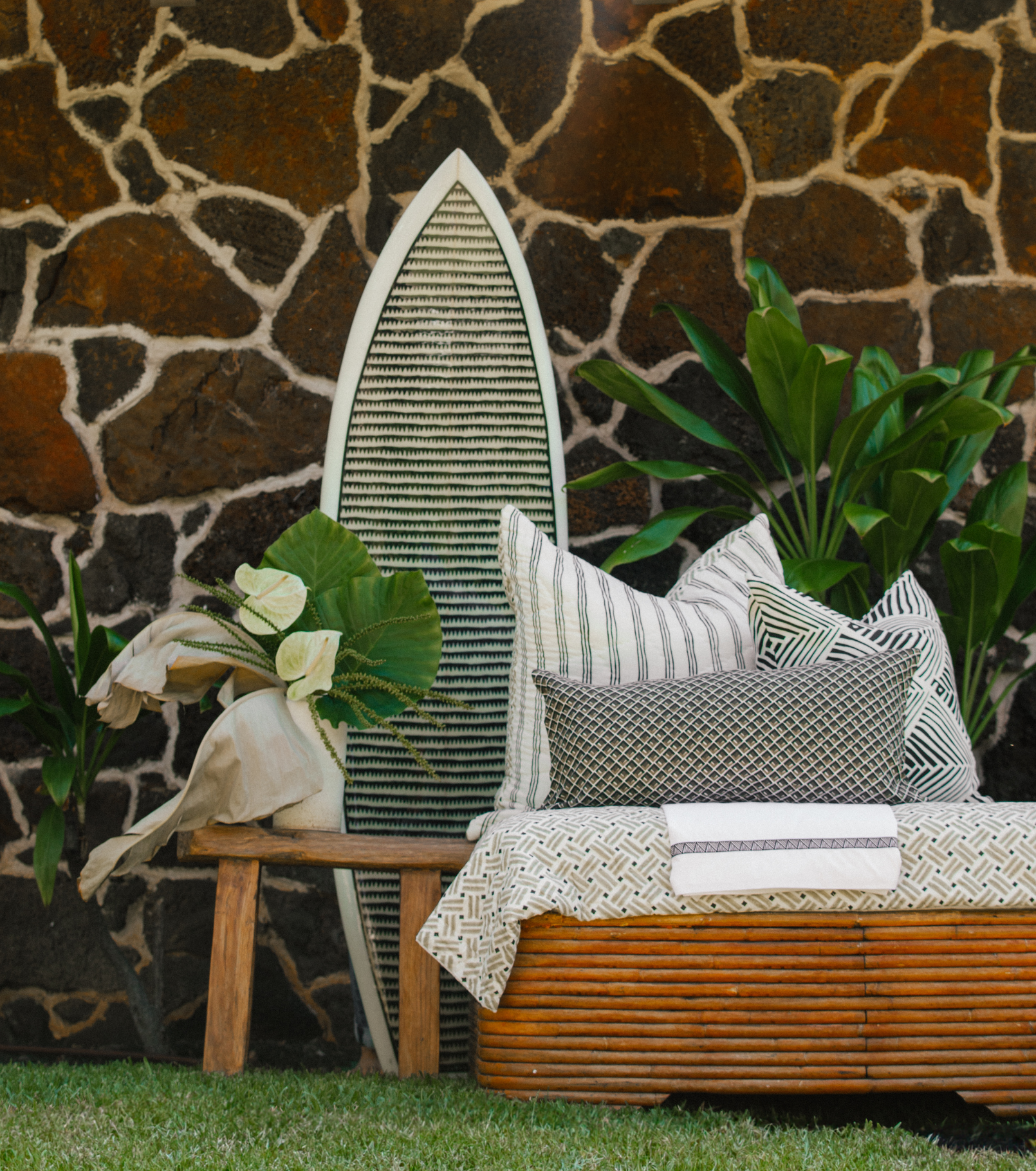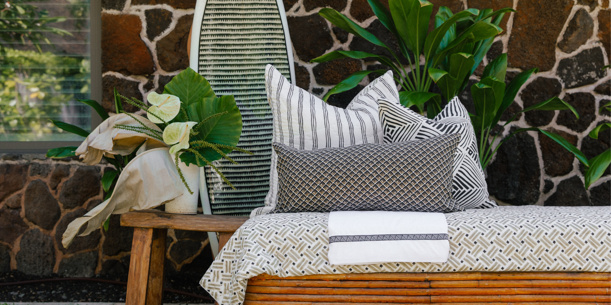 Our Big Island Bedding Collection features handcrafted block prints, reminiscent of basketweave on one side and a whimsical stripe on the reverse. Each hand-stitched quilt is made from exceptionally soft cotton voile and filled with pure cotton, making it equally suited to both balmy Hawaiian nights and as a cozy top layer on cooler nights.